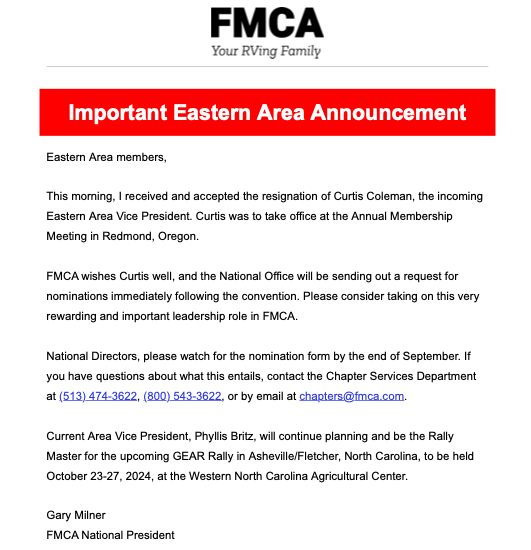 Most every month the Eastern Area Officers meet on-line via Zoom to discuss items such are the upcoming GEAR event and other Area-wide of FMCA concerns, events, information, etc. This most recent meeting was held on August