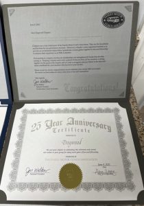 On June 6, 1996 a new FMCA chapter was formed, bylaws written and friendships grew. Now, 25 years later they celebrated with an anniversary rally. There are some photos, compliments of David Meyer, attached. These include a photo of the 25th Anniversary Certificate and congratulatory letter from FMCA president, Jon Walker, a photo of Steve Czarsty, one of Rob handing Ed Herbert the check and a group membership photo from the rally. Additional photos will be posted on their blog-site <here>